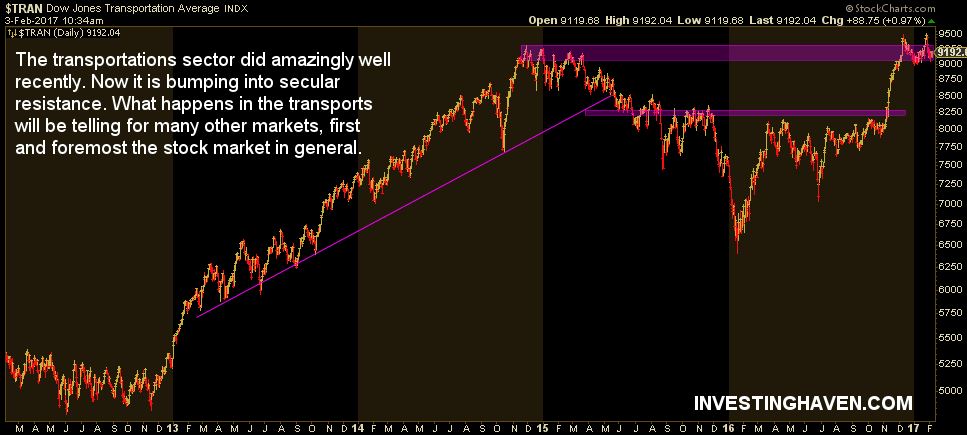 First, the transportation index is near all-time highs. As seen on the first chart, this is a major resistance area. What happens with the transportation index will have major implications on the stock market as a whole.