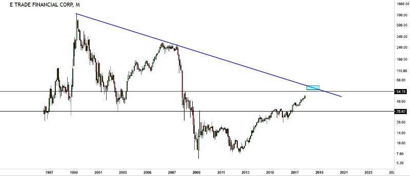 Charles Schwab (SCHW) – one of the famous investment and brokerage firms is set to test its all-time high at 51.25 (monthly chart). From there, either it consolidates before a convincing break or it can simply break out it straight away with a move towards 60-65 by the end of 2018. The downside risk is a swift retracement to ~39.