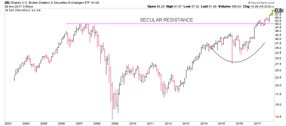 The monthly chart of IAI shows that after completing a pseudo U shape bottom, price finally broke out above resistance. And this signals that it could be time to allocate some funds though only in selected stocks.