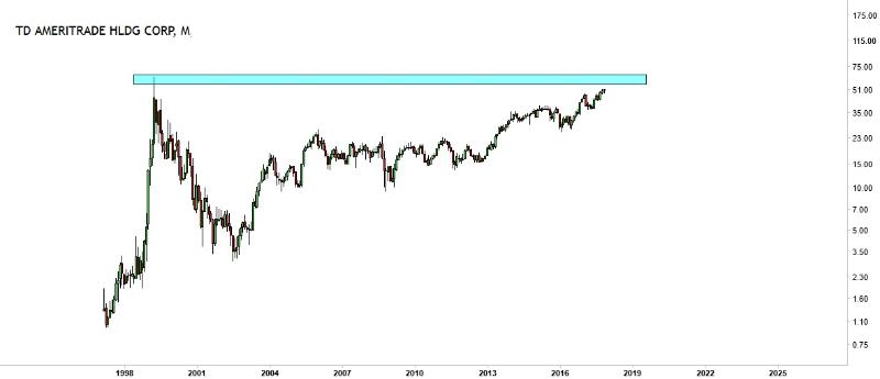 Next, we have TD Ameritrade (AMTD) which mimics the monthly chart of Charles Schwab. From the monthly chart price has 61.4 in sight before making an attempt to break out. Keep a close eye on the downside risk of ~37-46