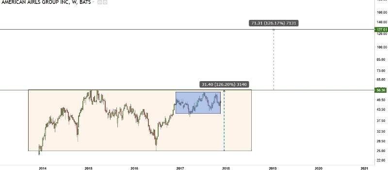 The weekly chart of American Airlines Group (AAL) shows that price has been consolidating in the rectangle box (see below). At the time of writing AAL is trading at 48.6. Our conservative target is that price will reclaim ~56.35 by end of 2018. The ultimate target of ~127 beyond 5 years will be a function on how lucrative the business will be going forward.