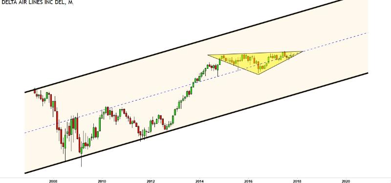 Lastly, the monthly chart of Delta Airlines (DEL) is going through a consolidation mode. Downside major support comes in at ~33.7 but we foresee price moving upt ~60 by end of 2018.