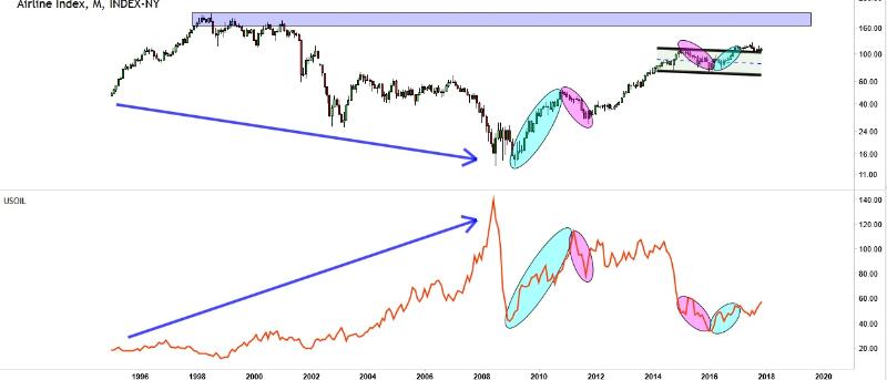 Before deep-diving into specific airline stocks we want to bust the myth that “when oil prices go up airline stocks go down due to lower revenues.” In the monthly chart below, the airline index is shown at the top while the monthly oil price chart is shown in the lower pane. Before 2008, higher oil prices were pushed down airline stocks. However, as of 2008 the highlighted areas show that oil prices can go up or down in tandem with airline stocks.