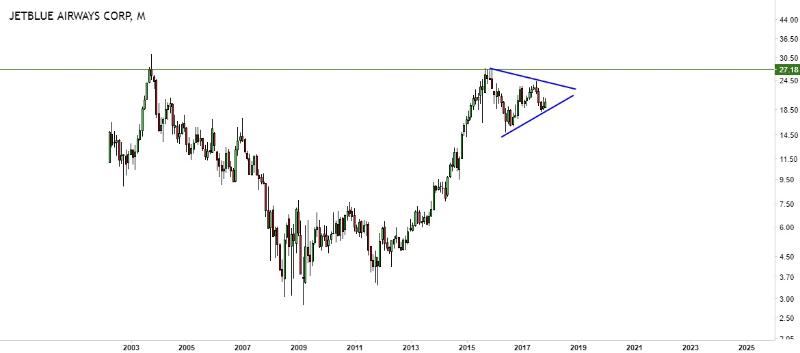 Jetblue Airways Corp (JBLU) is in the midst of forming a triangle, which we reckon is a low risk entry point with a target of ~27 by 2018. In case the price breaks above 27 in a convincing way we expect it will hit 40. Otherwise a nasty break down can half the price to ~9.40!