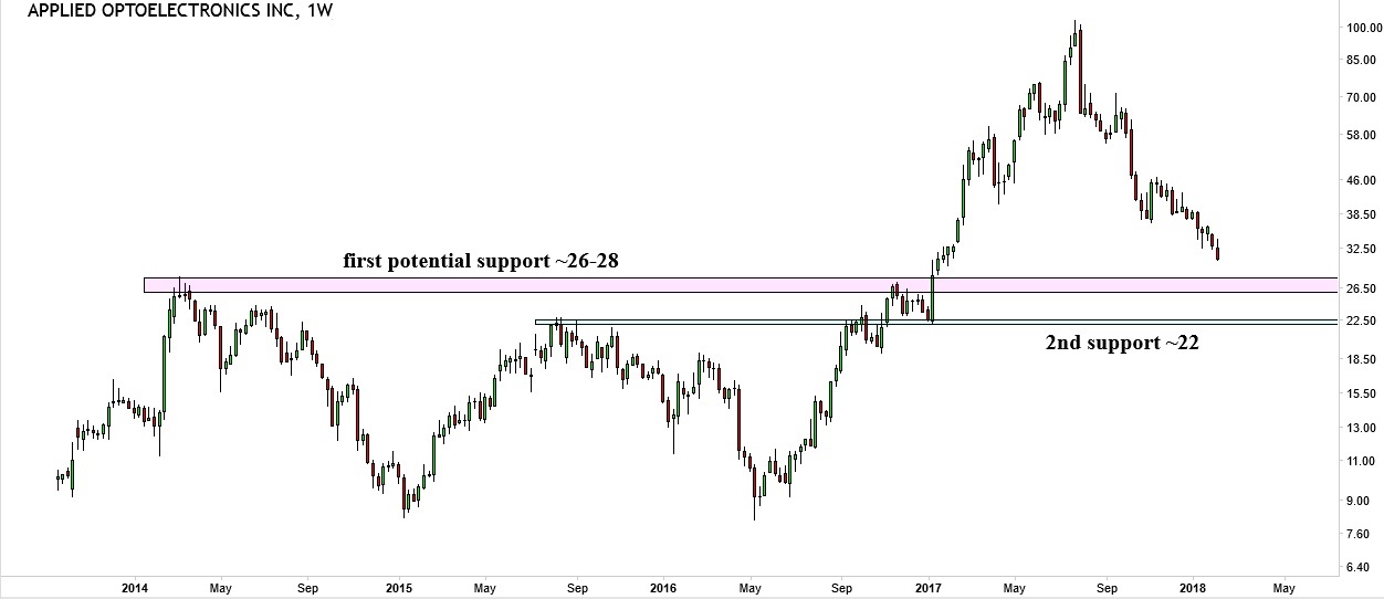 The weekly chart of AAOI above shows that after a price broke out of the “W” resistance of 28, the stock price had a stellar move to the top of 103. We project that the recent decline could come to a halt at the support level of ~26-28. We can’t guarantee whether it is good to investing even if price fell to this price zone as we need more candle patterns to confirm. Should this zone fail to provide support the next important support level will be around 22. The most hopeless scenario is if the price goes back to the price zone of 8.25 – 10 where the latter is the IPO price of AAOI back in 26 Sept 2013.