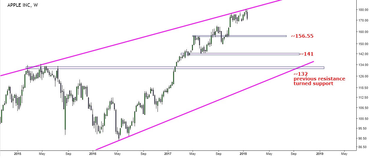 The price of Apple has been forming a potential pennant since Sep 2012. And for the 3 months of Nov 17 to Jan 18, price has been stagnated and couldn’t break the 177-180 resistance area. There is a high probability that a correction is underway. There are 3 crucial levels of downside support, smart investors are watching them closely.