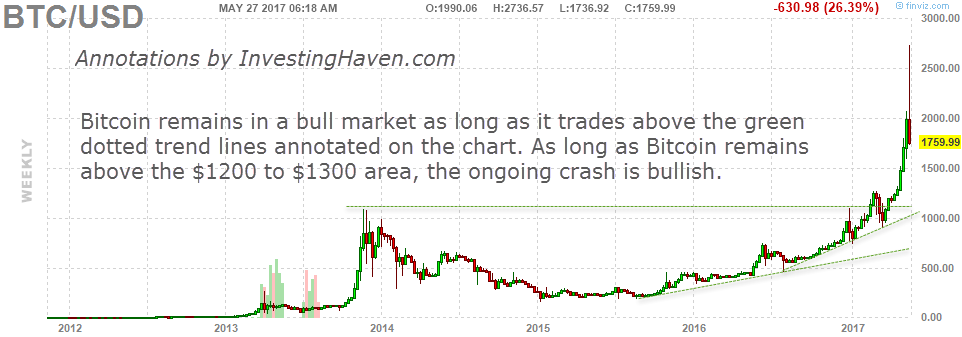 Combining all three trend lines make us conclude that Bitcoins remains bullish as long as it trades above the $1200 to $1300 area. As long as that is the case, the Bitcoin price crash of 2017 is bullish.