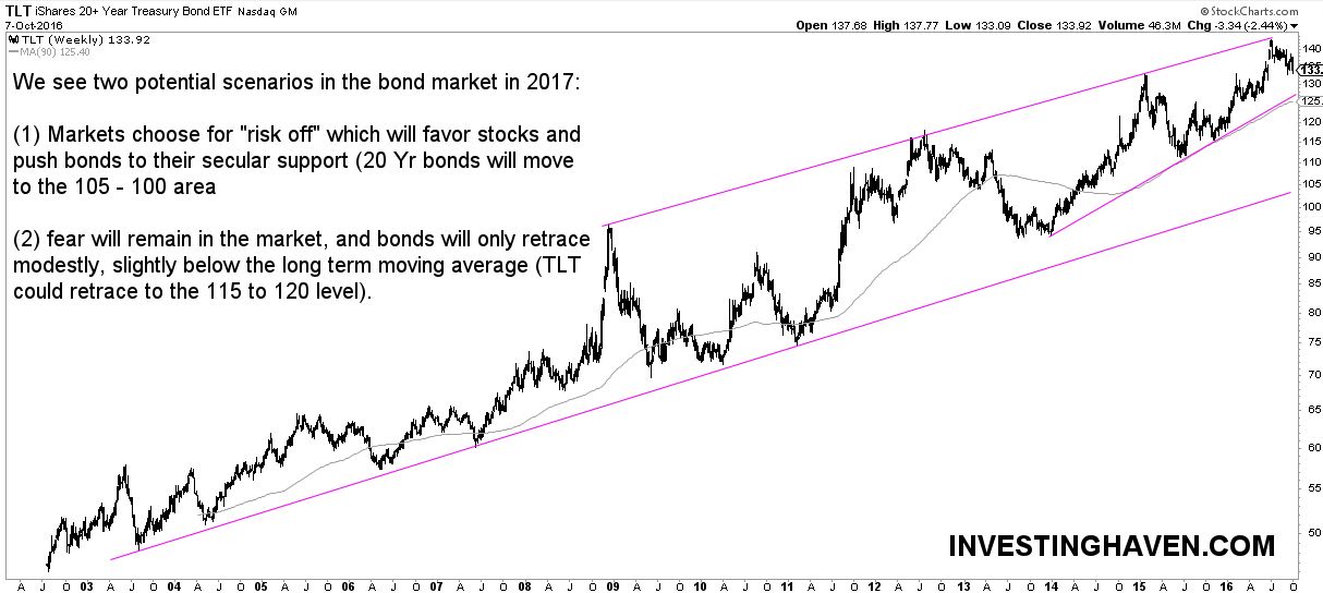 The easiest way to identify the bond market outlook for 2017 is to examine the following chart. It shows the 20 Year Treasury bonds since 2002 on a weekly chart. The pattern on the chart is clear: a rising trend channel since 2003, with a strong resistance line since 2009.
