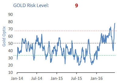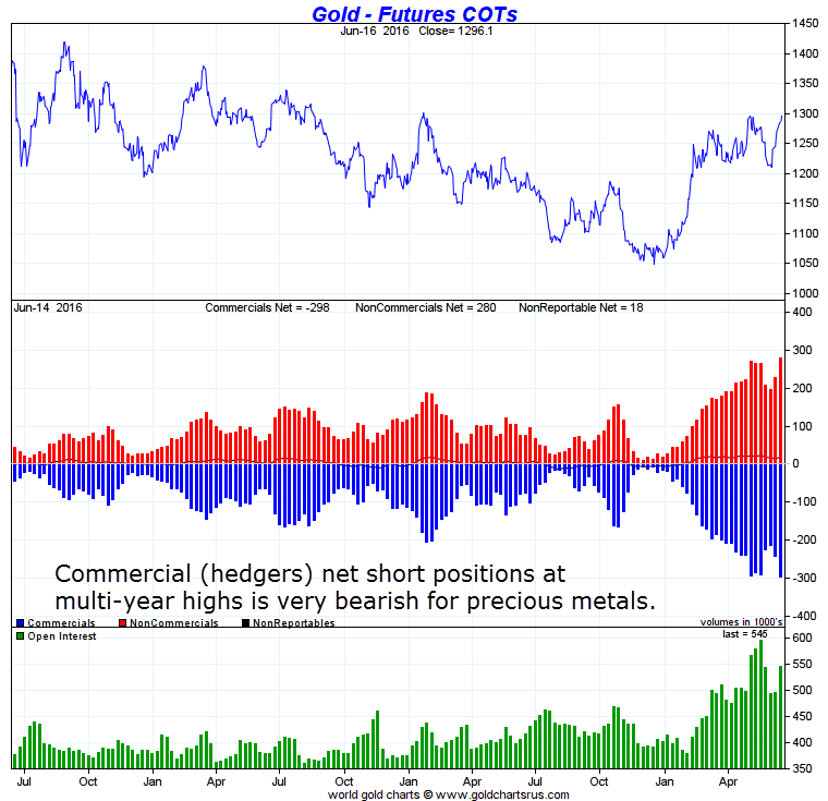 The two indicators that we consider most concerning are the Commitment of Traders (COT) data for both gold and silver. We have explained many times how we interpret the COT data: the faster the net short positions of commercials (hedgers) grow, to an extreme level, the more bearish the outlook for prices. Both gold and silver sax an extremely fast run up between January and March of 2016. That is very bearish. Chart courtesy: Sharelynx.