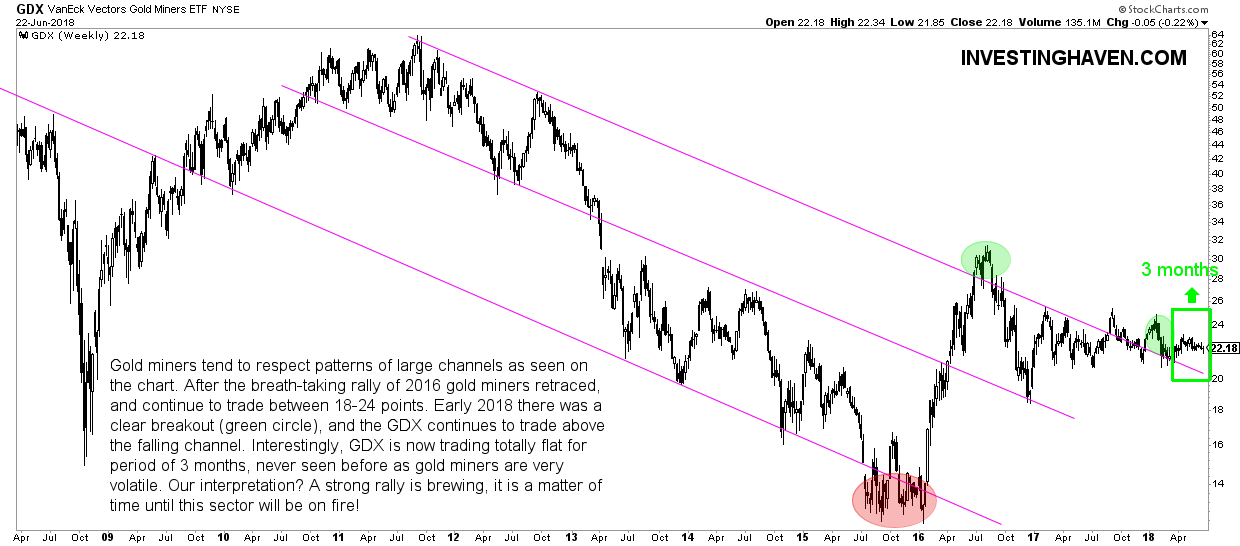 The gold stocks index GDX (GDX) has an amazing setup. Its 10-year chart makes the point. Especially the 2 green circles show a breakout attempt, once in 2016 and once early 2018. This, of course, is the first set of signs of a new bull market, or, at least, a bullish environment.