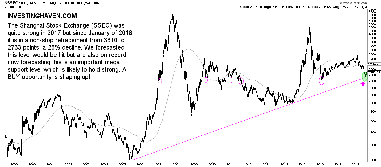 China’s stock market (SSEC) is one of the major themes at InvestingHaven in 2018. That is because its stock market was wildly bullish in the first weeks of 2018, next almost fell off a cliff only to touch secular support right in the week when President Trump’s induced trade war discussion got momentum. Our thesis was that it was a classic case of ‘sell the rumor buy the news’. Now it seems that we are absolutely right, and China’s stock market continues to look very bullish again for the remainder of 2018!