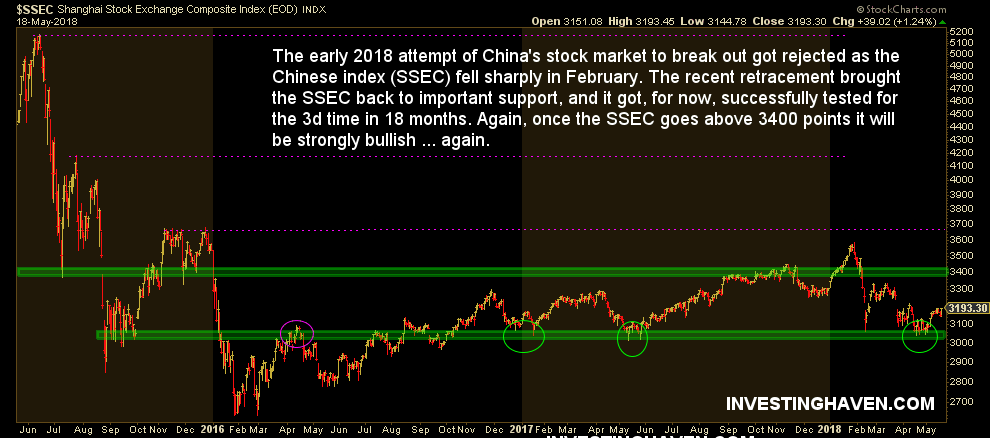 China’ stock market is in a long consolidation for almost 2 years now. When the Shanghai stock exchange (SSEC) recovered from its 2015 crash, it entered in April of 2016 the 3000 points area, and consolidated between 3000 and 3600 points since then. In May of 2018 the Shanghai stock exchange did something important: it tested successfully, for the 3d time, the 3000 point support level. We explain in this article why this is important.