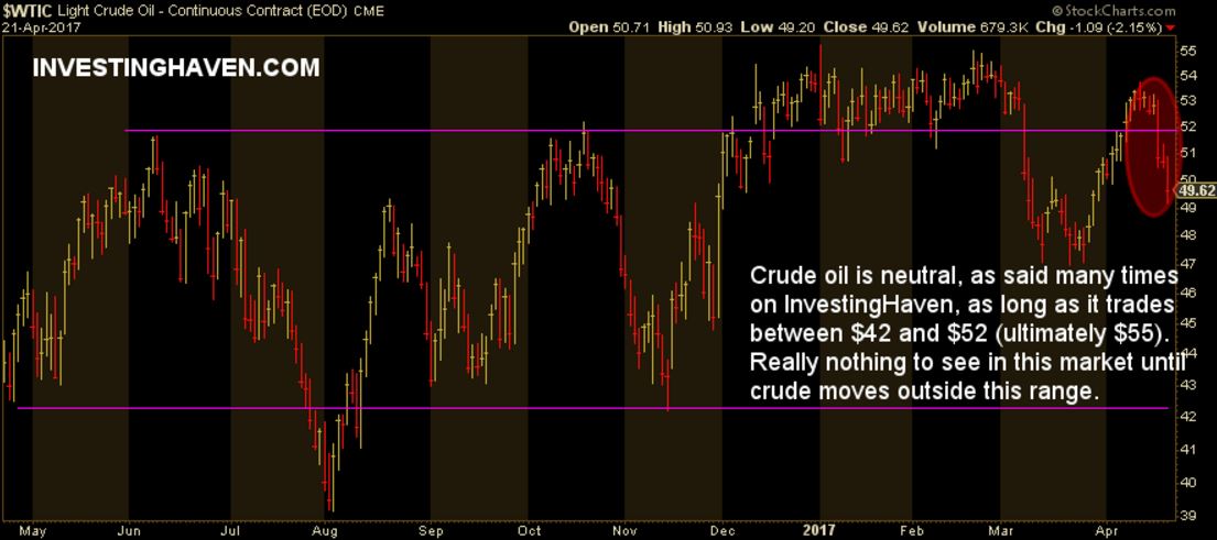The truth of the matter is that crude oil is going sideways for a year now, as seen on below chart. Support kicks in at $42, resistance is the $52 to $55 area. In between that area, crude oil is simply neutral.