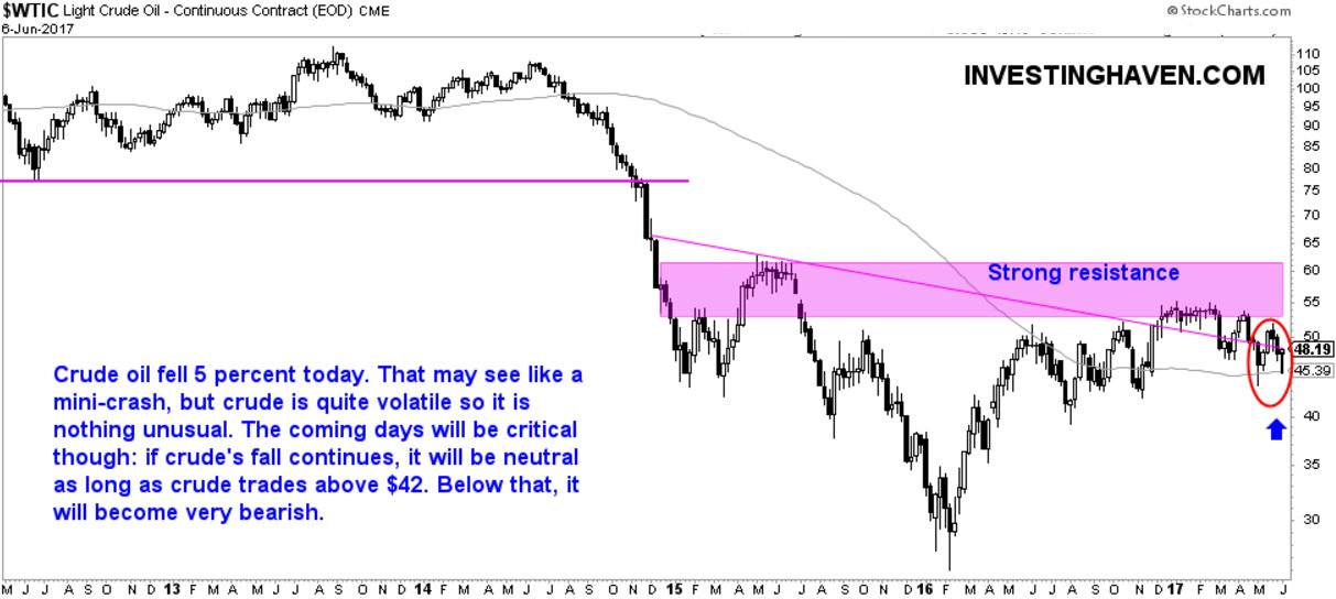 The line in the sand, for crude oil, is $42. Between $42 and $55 it remains range bound, or, in other words, trendless, and any news or mini-crash is meaningless in the bigger scheme of things.