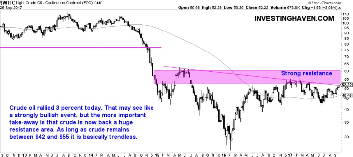 Crude oil has a giga resistance area starting at 54 USD. In the last 3 years crude oil has spent 90 percent of the time below 54 USD. The purple bar on the chart makes that point.