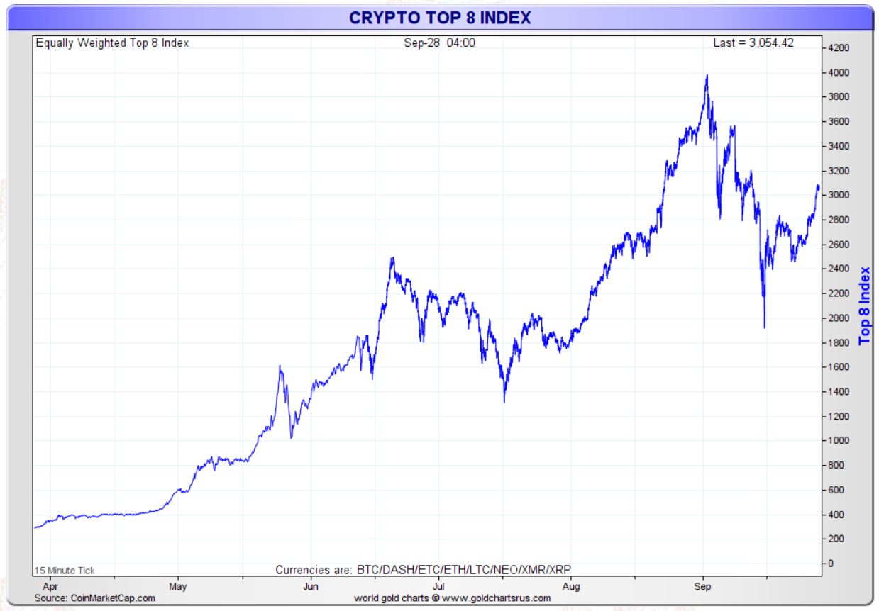Cryptocurrencies had an amazing month of August and almost crashed in September. What we wrote during that last crash is that as long as the aggregate top cryptocurrencies chart remains in a rising channel there is no reason whatsoever to be concerned.
