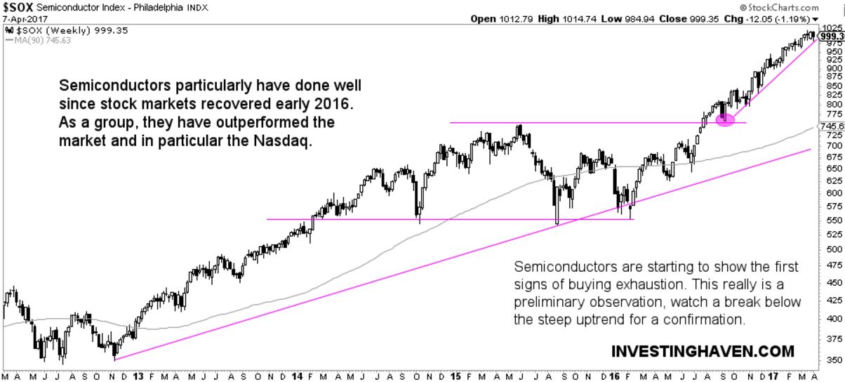 Now, if NVDA would fal, which we anticipate, it would have major implications for stock markets. The reason is that semiconductors have done very well since stock markets recovered early 2016. But as they have been leading stocks higher, stock markets need a strong performance in semiconductors to remain in a bullish environment.
