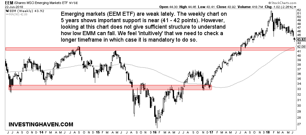 The weekly emerging markets chart on 5 years has some nice insights, first and foremost a longer term support zone in the 41 – 42 points area. However, there is visibly not sufficient info on this chart. What does this chart reveal in terms of longer term trends and forces at play? Intuitively, the answer is that not enough can be deducted from this chart.