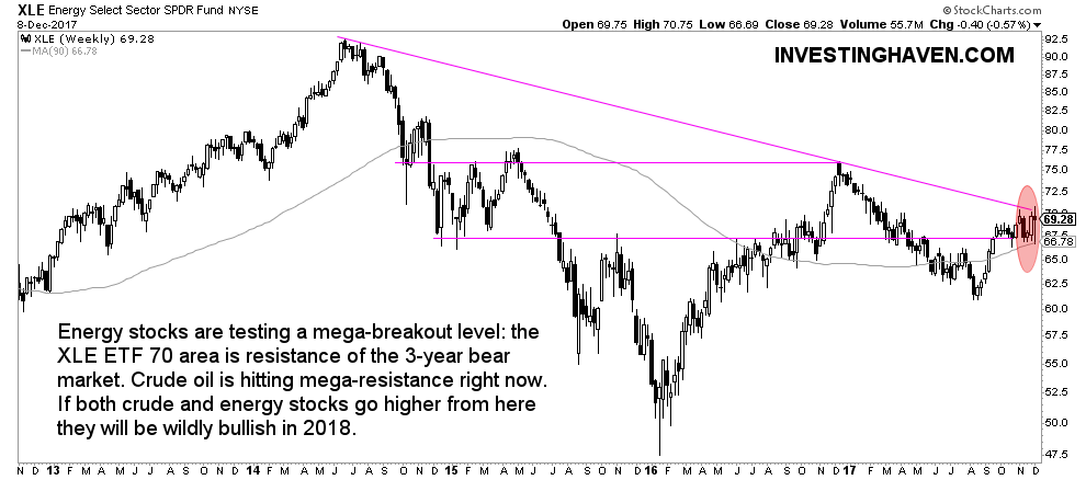 Energy stocks (XLE) are a real roller coaster. They tend to move aggressively in both directions. The extreme sell off two years ago got followed by a strong rally and a significant retracement recently. So what to expect going forward? This is InvestingHaven’s energy stocks outlook for 2018.