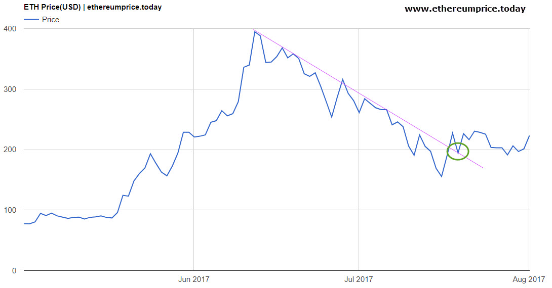 The 3 month Ethereum price chart shows the breakout and confirmation soon after (green circle).