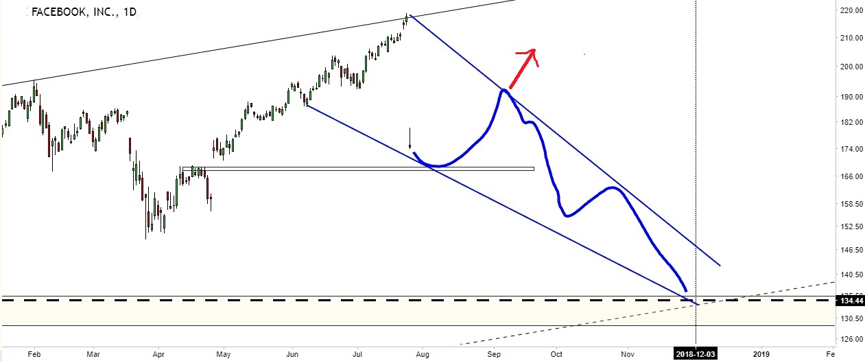 For this to answer we look at the combination of the monthly and daily charts. The monthly suggests there is downside until the support line of the rising channel. To get detailed price info, we have to check the daily where we can see two things. First, there is a first area of support right at $166. However, if $166 does not hold, then our best forecast is that Facebook will fall until the $130 to $140 level. If that were to happen, it would be an amazing buy opportunity.