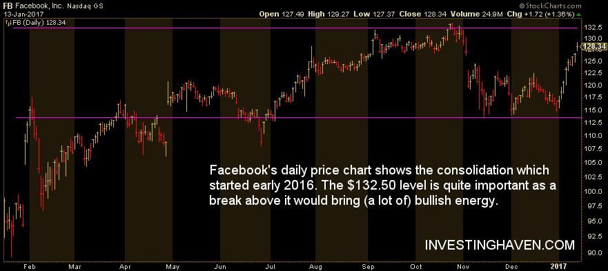 The daily chart of Facebook’s stock price is even more interesting. Facebook’s daily shows the consolidation which started early 2016. The $132.50 level is quite important. Why? It is not only the stock’s all-time high, but a break above it would signal a bullish breakout which, in turn, would induce a lot of bullish energy. As said earlier, investors become excited once a price is rising. That is fueled by financial media. And it becomes a vicious cycle … at least for a while.