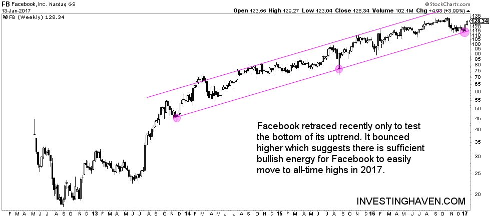 InvestingHaven’s research team sees Facebook’s recent retracement as a bullish sign. Facebook’s stock price recently tested the bottom of its secular uptrend. It bounced higher which suggests there is sufficient bullish energy for Facebook to easily move to all-time highs in 2017.