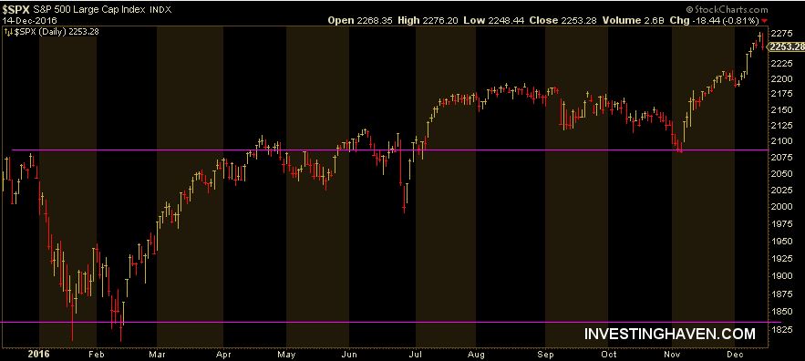 Basically, the S&P 500 chart is as simple as it can be. There are two support lines, which provide support going back to 2015 (not is everything is visible on this one-year chart though). The first part of this year was centered in the lower support area. After the summer, the stock index was trading above the upper support line. Early November, there was a final test of support, with a decisive break higher.