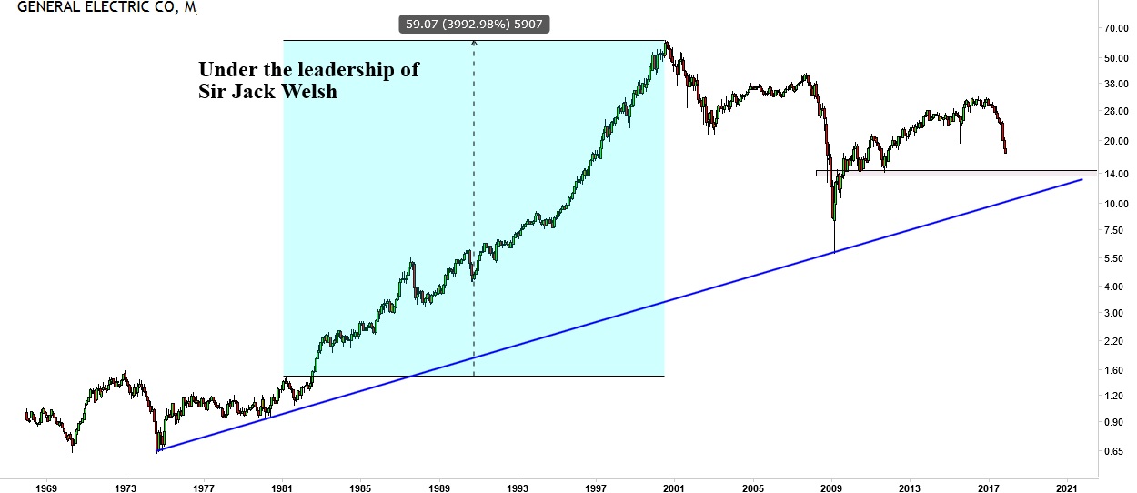 The monthly historical chart of GE shows the enormous price gains under the leadership of Sir Jack Welch up to 2001 (light blue area).