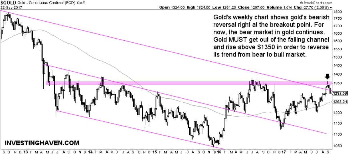 Gold’s bearish reversal is shown on the chart with the black arrow. The $1350 level marks a triple top, heavy resistance which goes back to 2014. Not any market can easily break out of that type of resistance, that is a natural law.