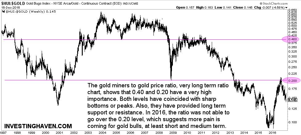 The area below 0.20 is clearly very bearish. The gold market got into that bearish area after the catastrohic collapse of 2013. Interestingly, gold tried to break through that important 0.20 area in 2016. That happened at a time when ‘everyone and his uncle’ was bullish on gold. At that point, we wrote our bearish gold price forecast for 2017. The ratio not being able to go through 0.20 suggested the bear market was not over.