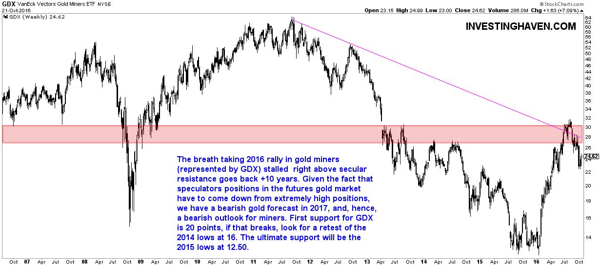 The chart pattern confirms expected intermarket dynamics, which makes for a bearish 2017 forecast for gold miners. We expect gold miners to test the 2014 lows, and, if those lows give away, the 2015 lows. However, we also believe that will be the ultimate retest, and, after that, the gold bear will finally give up after 6 to 7 years, making place for a renewed secular gold bull market.