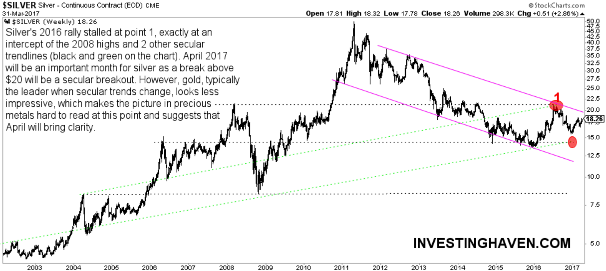 Silver’s 2016 rally stalled at point 1 (below chart), exactly at an intercept of the 2008 highs and 2 other secular trendlines (black and green on the chart). April 2017 will be an important month for silver as a break above $20 will be a secular breakout. However, gold, typically the leader when secular trends change, looks less impressive, which makes the picture in precious metals hard to read at this point and suggests that April will bring clarity.