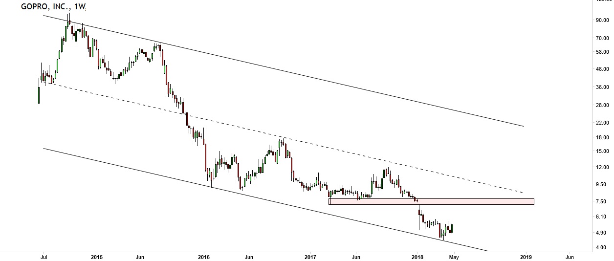 On 26 June 2014, the stock price of GPRO opens at 28.65, and made an stellar move to 97 within a matter of just 3.5 months. Subsequently, the stock price had a disastrous plunge for the next 3.5 year plunging 95% to the low of around 4.50.