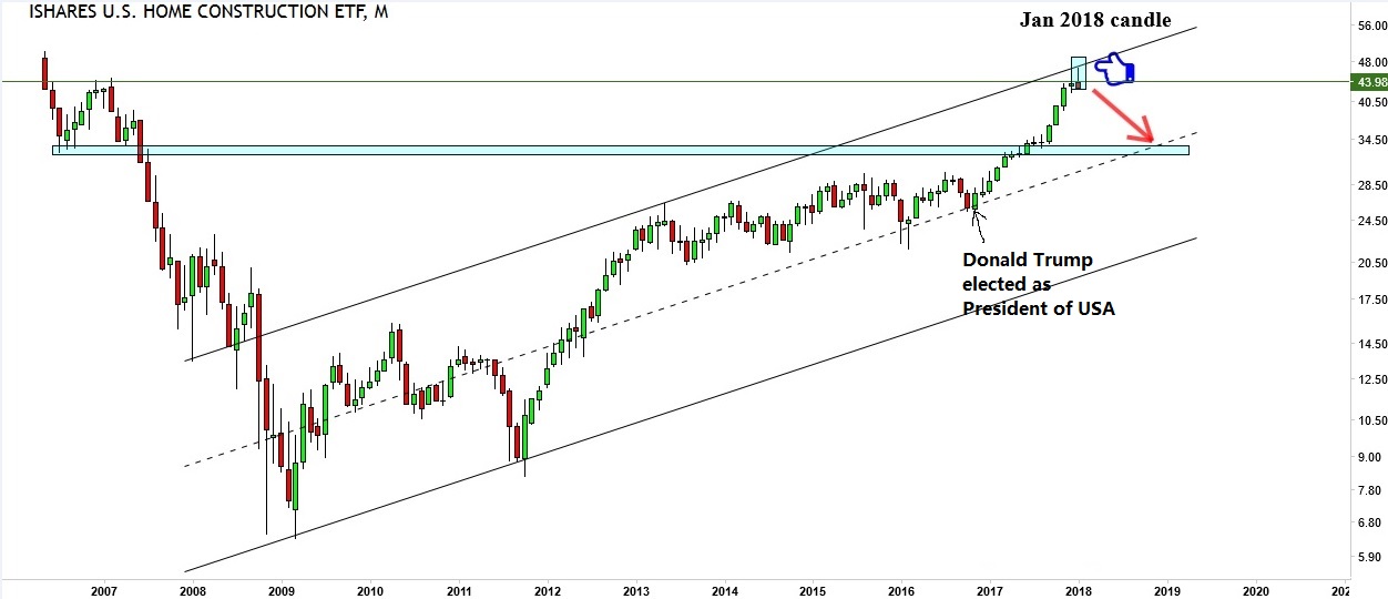 Ever since Donald Trump is elected as the President of the USA, the home construction industry has had a very flourishing 14 months since Nov 2016. That is also what the monthly chart of the ITB signals, the Home Construction sector ETF. And the entire market was very upbeat about the future, it had no protection against the downside. InvestingHaven research team’s philosophy is to focus on the big picture using the monthly candlestick chart as a guide for future market direction.