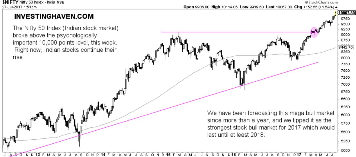 The Nitfy 50 index representing the stock market in India crosses 10,000 points. It now trades at all-time highs, and is poised to go much higher in the 24 months ahead. No surprise, InvestingHaven‘s research team forecasted this strong bull market last year in several articles, one of which India Stock Market Outlook For 2017, and, last year April, It’s Official: India Stock Market Breakout Is For Real.
