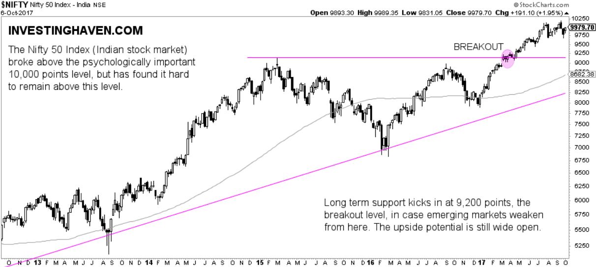The daily Indian stock market chart shows a potentially concerning event. We look at the Nifty 50 which represents the 50 largest stocks in the Indian stock market. The Nifty 50 crossed twice the psychologically important level of 10,000 points, once in July and once in September. Since then, however, it retraced and even got outside of its rising trend channel, on the daily chart.