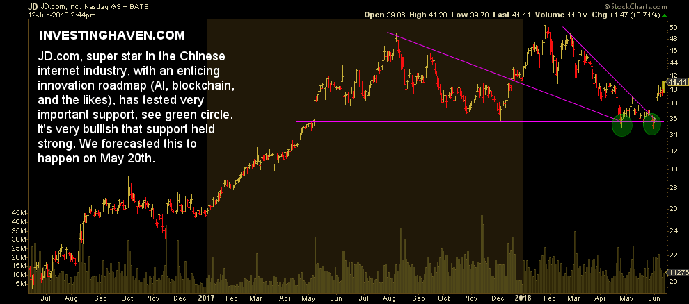 The ‘latest and greatest’ chart of JD.com shows our point. Last week was a great entry point after 52-week lows were tested successfully in the last week of May. A strong bounce from support to the $38 level was the trigger exactly in the way we explained it.