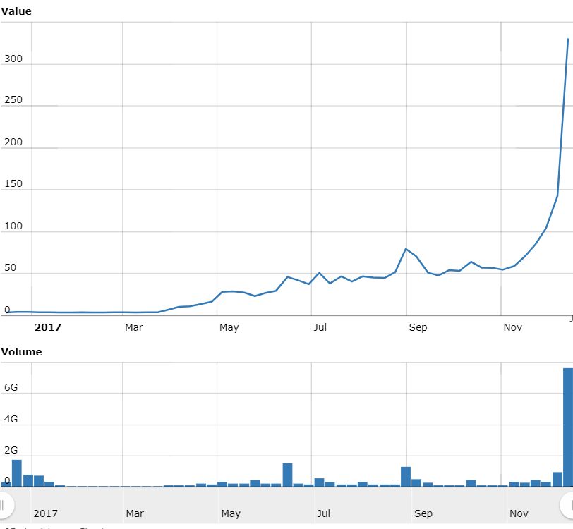 The price of Litecoin touched $400 today. This is a tenfold increase since it broke out of the $36 to $40 level.