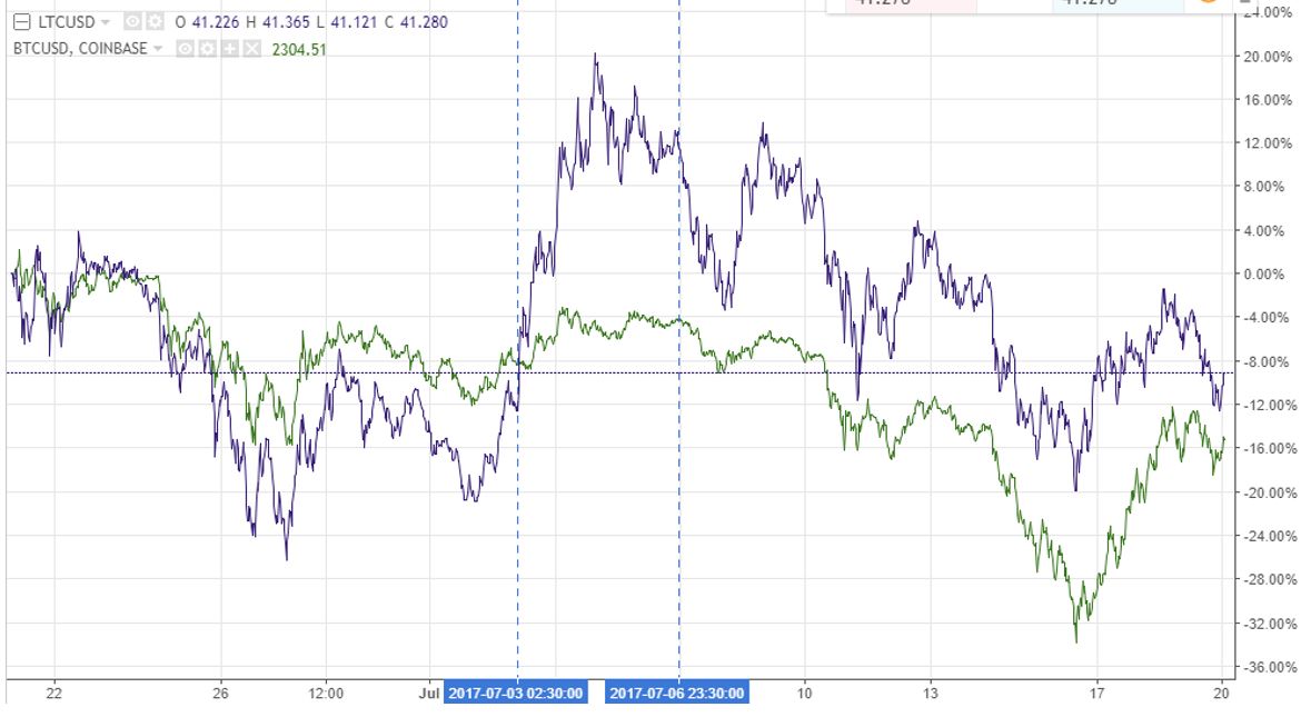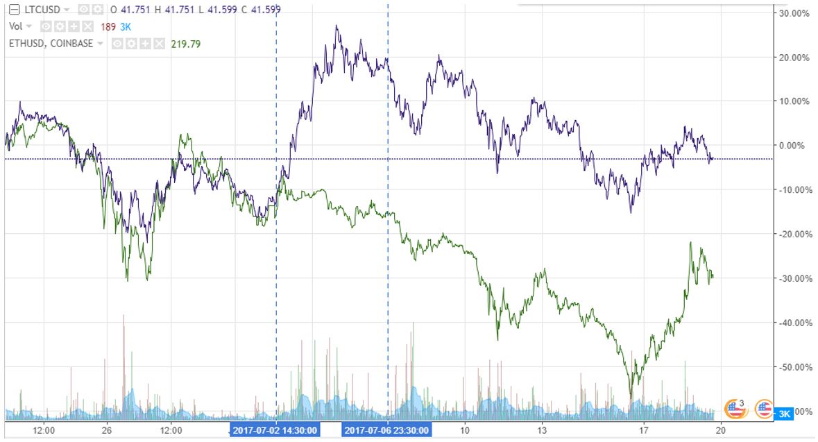 Something unusual happened as of July the 2nd. After a tight positive correlation, Litecoin broke out and not only outperformed Ethereum, but it also reversed the positive correlation they had.