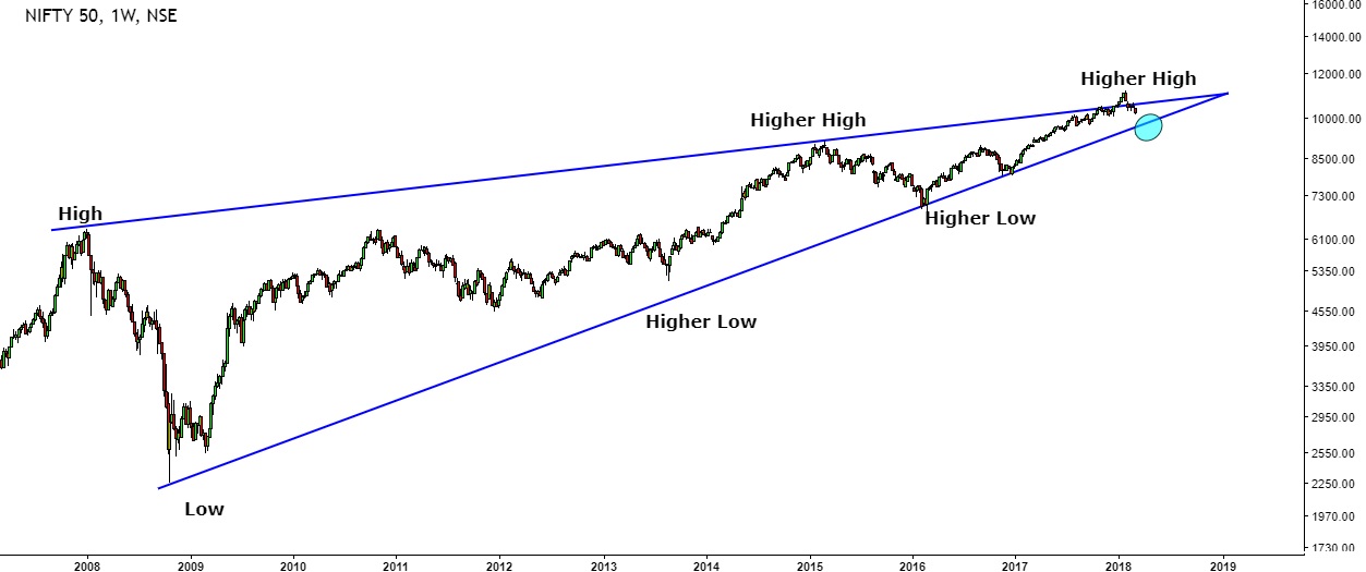 The weekly chart of Nifty 50 since 2008 shows a series of Higher High and Higher Low which is the characteristic of typical bull market.