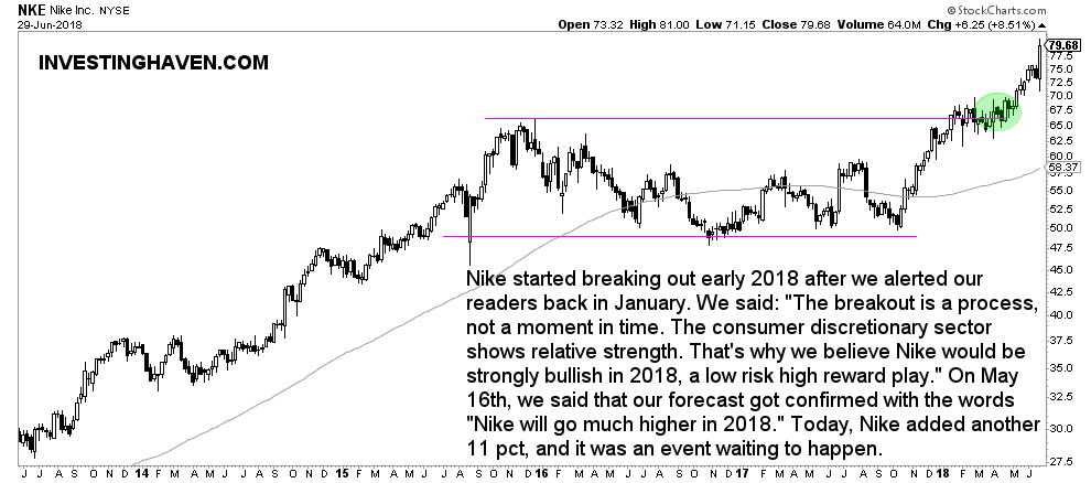 As per InvestingHaven’s methodology Nike’s breakout was in the making for a long time, and one could see it coming because of the fact that the chart, financials and fundamentals were all bullish, perfectly aligned.
