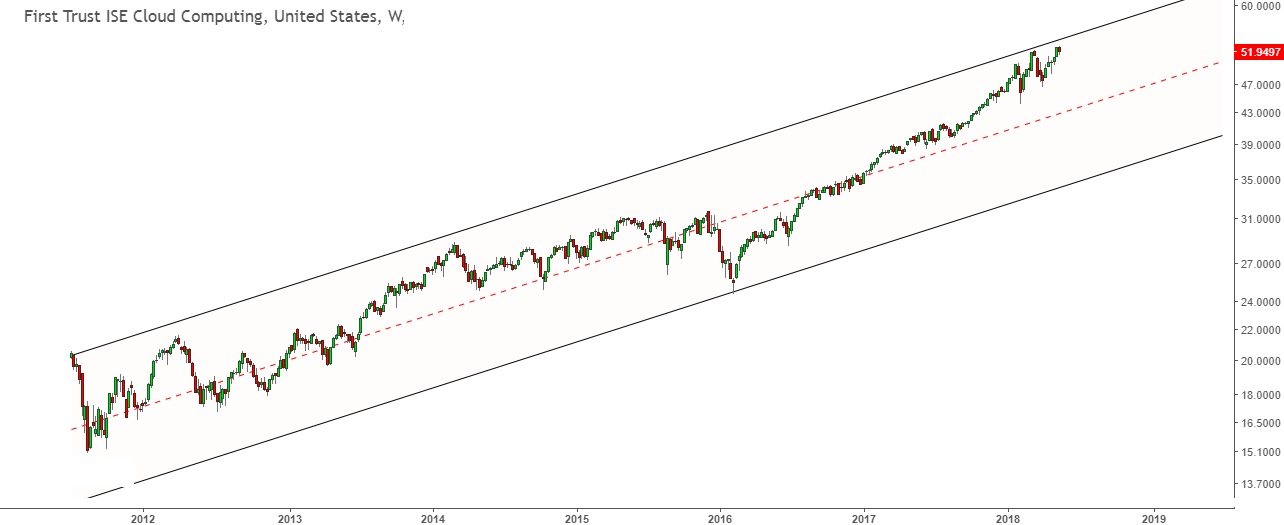 Cloud computing stocks went through an amazing uptrend in the last 30 months. The sector ETF SYY has doubled in that same period of time. However, based on the chart setup, we may be looking at a huge though intermediate top that cloud stocks are setting in 2018.