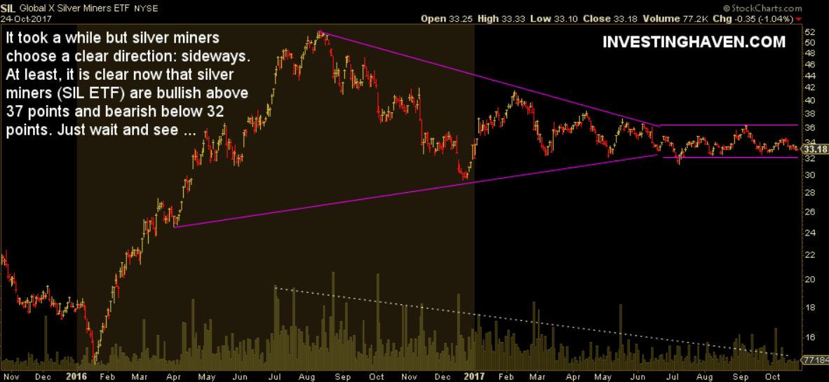 - Silver miners break out once SIL ETF moves above 37 points, and stays there for at least one week. That would make silver miners bullish.