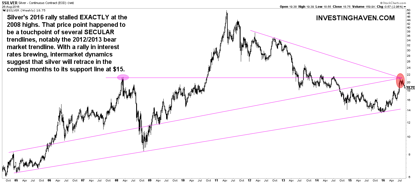 Let’s get things straight when it comes to silver (and gold): its outlook is NOT looking good. The fact that the 2016 silver price rally stalled exactly at the 2008 highs which happens to coincide with a secular bear market trend line is really not good.