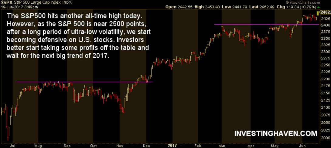 U.S. stocks are moving higher again. The leading stock market index in the U.S., the S&P 500 (SPY), is about to close at 2452 points today. That is another all-time high. This is extremely strong, that is a fact.