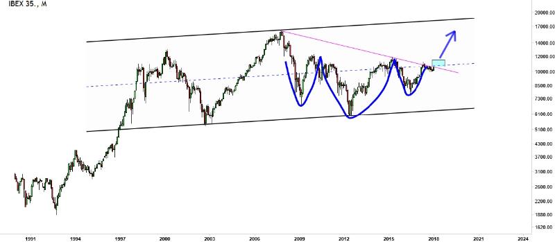 There was a dynamite growth from 1992 to the top of 2000 that coincided with the global dotcom bubble. The index recovered early 2003, and made a five year sprint before hitting a major wall which coincided with the global financial crisis of 2008. Ever since, the price movement was more erratic. The trend channel annotated on our chart illustrates the massive consolidation of price for 20 years since 1997 and InvestingHaven considered this as a potentially massive bull flag. Due to the uncertainty in Spain from 2008 to present, price has fluctuated below the median line most of the time, and ultimately morphed into a potential inverted head and shoulders. Traditionally, price of this pattern is bullish unless price moves swiftly in the different direction.