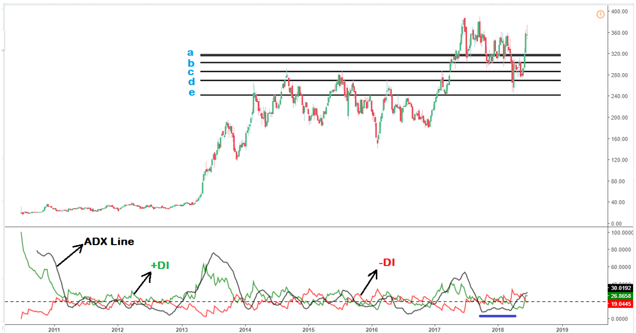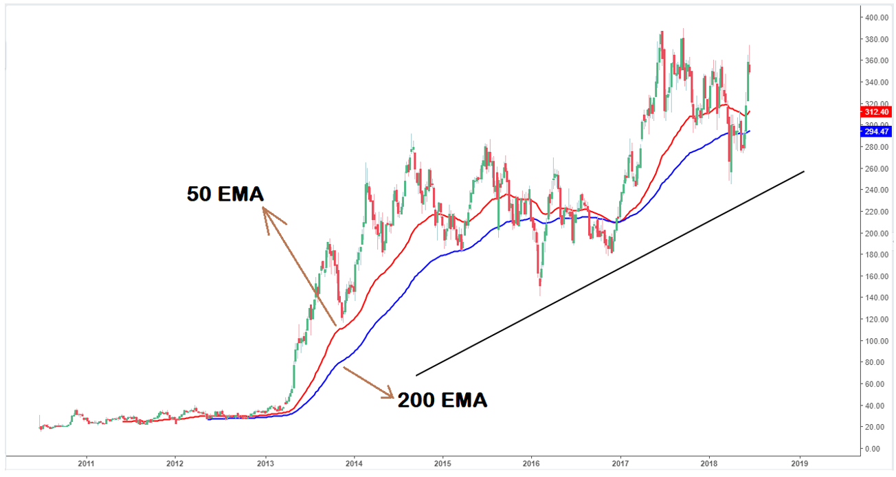 The Weekly timeframe chart of Tesla Inc. (TSLA) as shown above captures price action since the inception of the company. A 200 exponential moving average (EMA) and a 50 day exponential moving average as shown on the chart indicate a “Golden cross” with the latter (50 day EMA) above the former (200 day EMA).