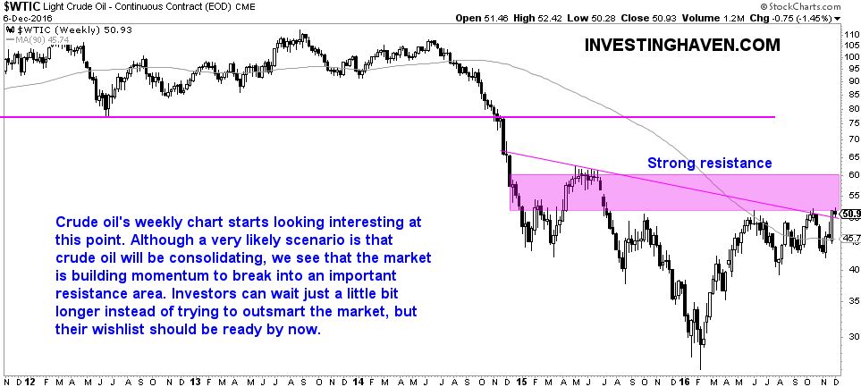 The most interesting observation on this chart is how crude is building a base right below that strong resistance area. We have not seen that before. It does not guarantee that crude will break through this area, but it suggests the market is succeeding in such an attempt.
