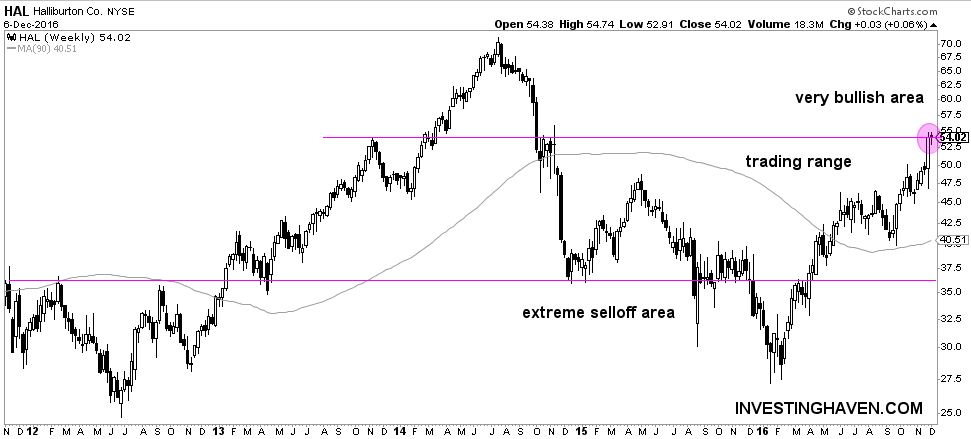 In case crude oil breaks through this important $50 area, we expect energy shares to start rallying. In such a scenario Halliburton (symbol HAL), one of our favorite energy stocks, has quite some upside potential. We see an easy ride to its all-time highs at $70, a 30 pct rise from today’s price point.